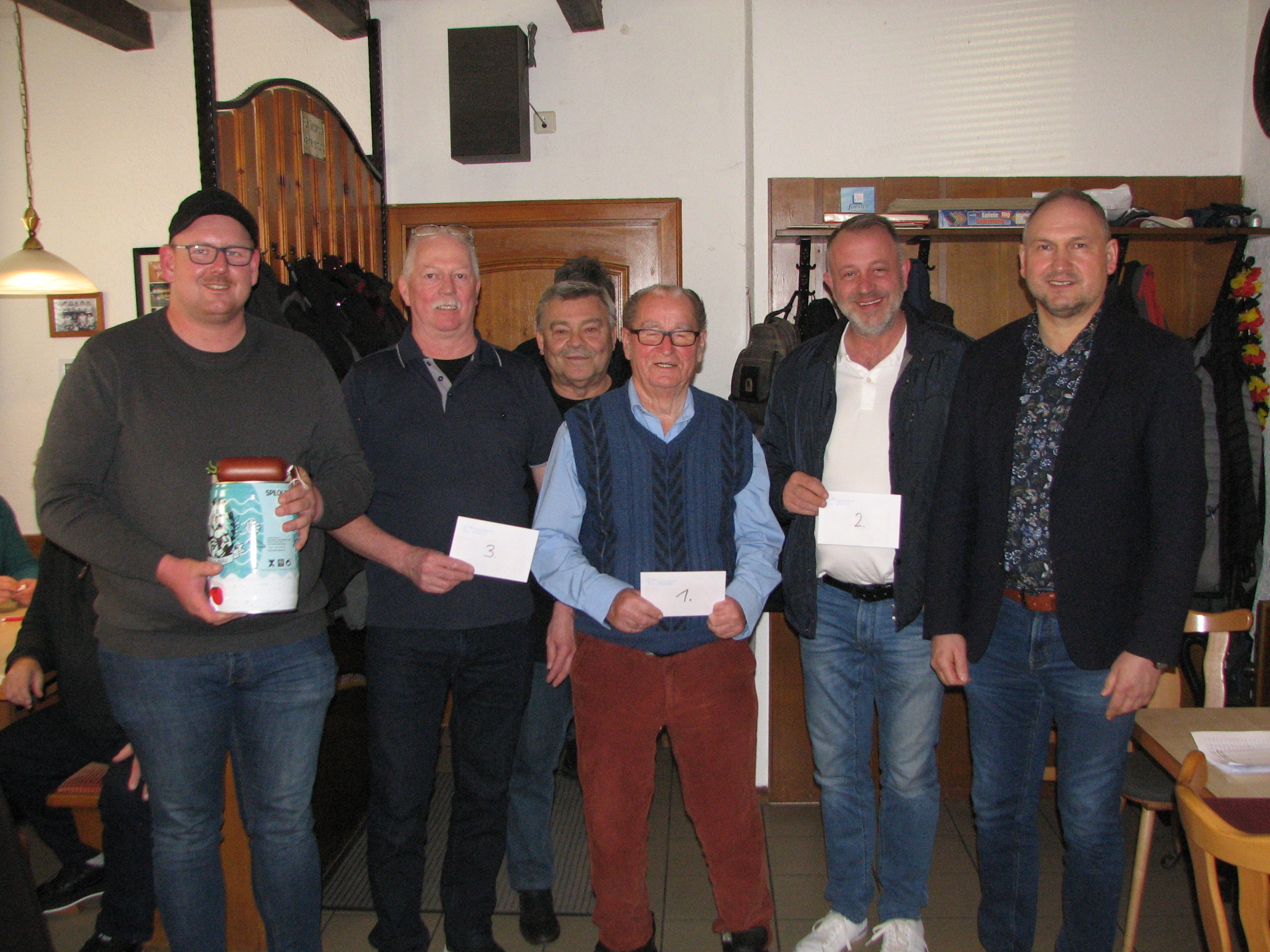 Herbert Steiner (hinten Mitte) und Bürgermeister Richard Kammerer (rechts) beglückwünschten die Sieger Josef Rieder (vorne Mitte), Daniel Schuster (2. v. r.) und Rainer Prölß (2. v. l.) zu ihren Preisen. Markus Schlagenhaufer (links) nahm mit Freuden den Trostpreis entgegen.